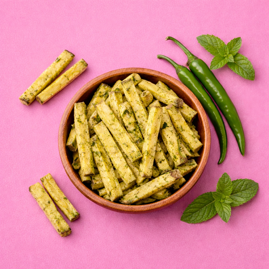 This one plays with contrast. The natural sweetness of sweet potato meets a quick hit of chili heat, followed by a fresh burst of mint that cleans the palate and keeps things interesting. The flavor moves in layers, starting bold and finishing light, making every bite feel refreshing yet addictive. Crisp, vibrant, and unexpectedly smooth, this snack is designed for those who enjoy flavors that evolve as you eat.