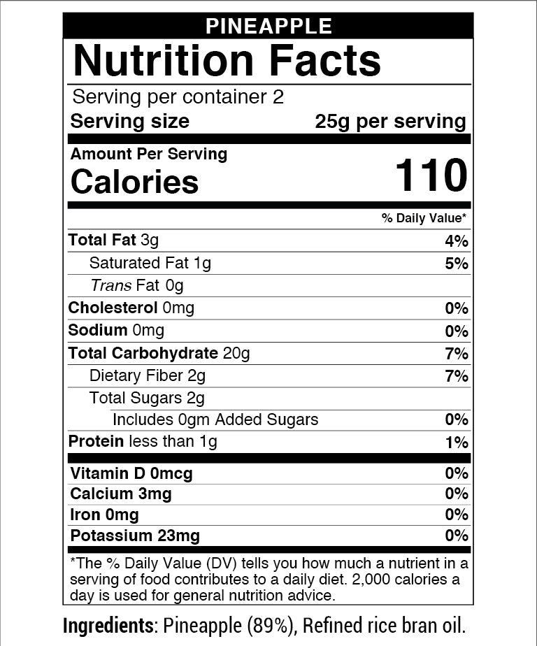Pineapple is nature’s way of mixing sweetness with a spark. Grown under warm tropical skies, ripe pineapples develop a juicy depth of flavor that is both bright and deeply satisfying. Our pineapple chips celebrate that contrast. Each slice captures the fruit’s naturally tangy edge balanced with mellow sweetness, finished with a clean, crisp bite. It’s lively without being sharp, sweet without being heavy, and crafted to let the true personality of pineapple shine through in every crunch.